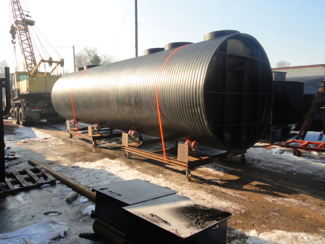 Габариты очистного сооружения: 2 емкости длиной 8400 / диаметром 2400 / весом 9800 кг.